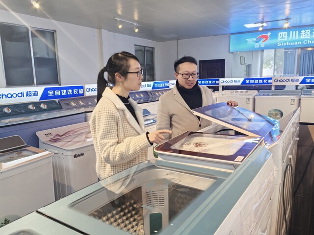 绵阳师范学院智能制造学院博士陈多礼(右)与四川超迪电器实业有限公司副总经理吴冬梅查看智能化产线改造情况。