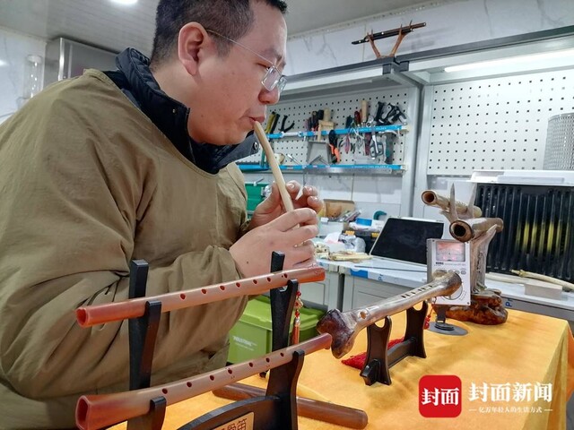 2005年,即蒋小龙23岁那年,他从央视纪录片上看到,鹰笛(骨笛的一种,用雄鹰翅骨制作)制作技艺面临失传,便用业余时间悄悄学习骨笛制作技艺。2022年,他更是辞掉工作,把自己的家改成工作室,全职研究、学习骨笛制作技艺。“问道‘奇人’和博览群书,这是我学习的绝招。”蒋小龙如此总结。