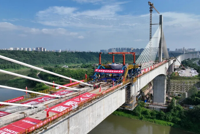 全线新建23座隧道,而新江门二号隧道、新响水函一号隧道穿越泥岩地层,这类地层遇水易软化,极易引发坍塌。建设者创新研发“泥岩地层单线铁路隧道安全高效机械化施工技术”,通过超前地质预报、机械化支护等手段,不仅保障了围岩稳定,还将隧道施工效率提升20%;104座桥梁中,泸州金山沱江铁路大桥最为亮眼,这座大桥跨越沱江主航道及水生珍稀鱼类保护区,主桥全长为2408.72米,是国内首次采用W形截面的铁路斜拉桥,为国内最大跨度的铁路单索面斜拉桥。胡市镇特大桥下穿绵泸高铁内自泸段、上跨车水马龙的厦蓉高速,在安全浇筑完成重达5300吨的简支拱后,整体落梁1.5米,创下国内铁路桥梁高位落梁的最大重量纪录。