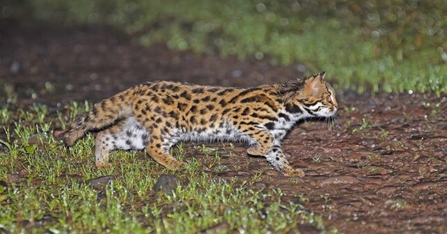 2025年5月,船山区一处浅丘林地的红外相机记录下罕见一幕:一只身上布满铜钱状斑纹的豹猫,正警惕地穿过镜头视野。这是遂宁主城区边缘首次记录到豹猫的野外活动影像。