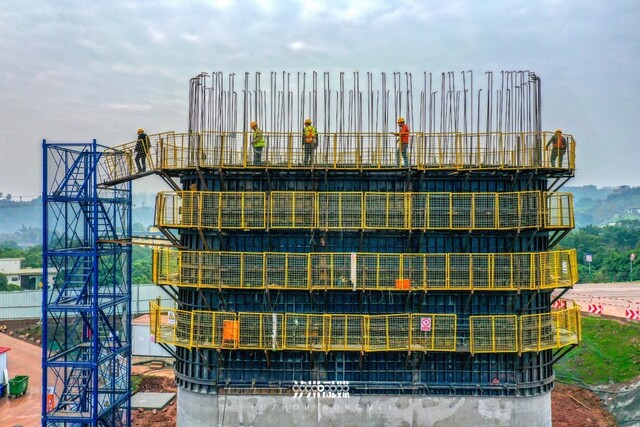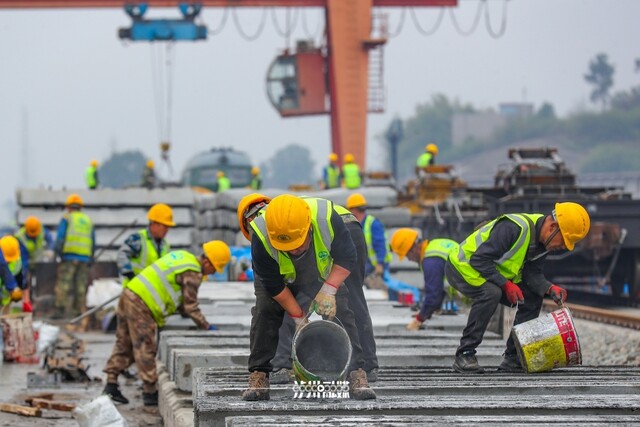 2023年7月17日16时许,位于江阳区况场街道境内的西部陆海新通道隆泸叙铁路施工现场,建设者们身着工作服,头戴安全帽,系上安全绳,冒着高温进行铁路桥墩施工,现场热火朝天。