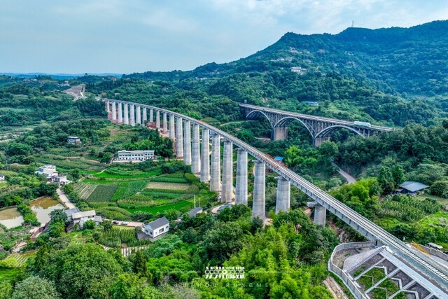 2025年6月10日,在泸州市江阳区方山镇云峰村附近,西部陆海新通道隆泸叙铁路与G76厦蓉高速公路“同框”。