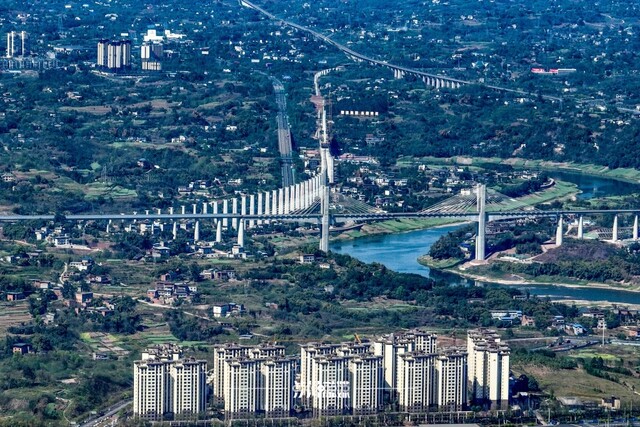 2024年3月25日,西部陆海新通道隆泸叙铁路、渝昆高铁、G76厦蓉高速公路与远处的绵泸高铁内自泸线,在泸州市沱江畔“同框”。