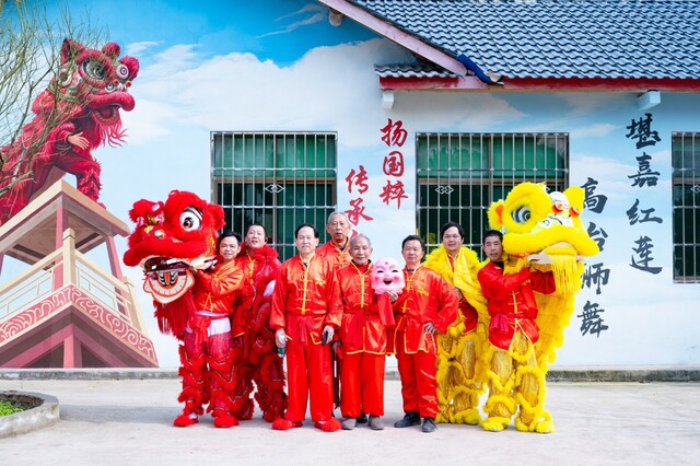 好在,政府的支持和申遗成功,为堪嘉狮舞打开了新的可能。堪嘉镇政府修建了傅强高台狮舞基地,配备了训练房和道具存放室;尝试“互联网+非遗”模式,通过抖音直播、短视频等方式扩大影响力;开展线下“送文化下乡”活动,并走进中小学校园,激发青少年对传统文化的热爱……