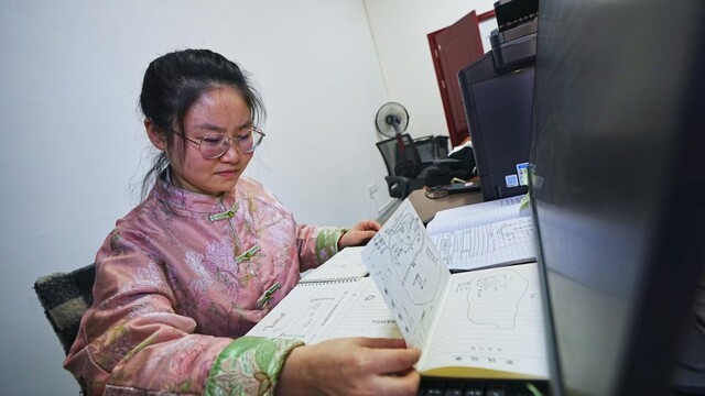 吴彤正在整理手绘的龛窟立面图。潘政吉 摄