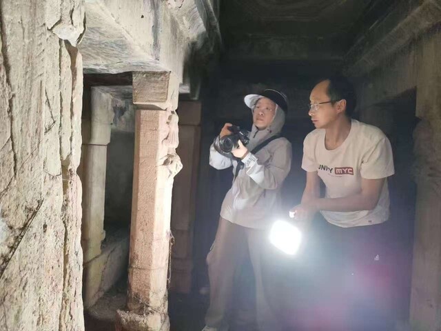 2024年8月,地表温度逼近50℃,作为安岳县“四普”第六调查组组长,吴彤带领5位队员深入该县东南部的深丘。“搜寻、定位、测量、绘图,我们干的既是‘考古’也是‘探险’。”吴彤回忆,彼时他们每天天不亮就出发,用镰刀在无路处开路,用直梯攀爬险峻崖壁。一次翻开石板,与长蛇四目相对的惊悚;另一次惊扰马蜂,队友手臂被蜇得肿起大片;高强度的工作,让她一度失声……这些,已成为吴彤“四普”的难忘记忆。