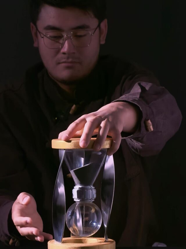 传统器物如紫砂壶、印章等方案先后被否,“因为那样就看不出来月壤本身的样子了”。最终,沙漏的构想被确定下来——沙漏是中国古代就有的计时器,而复刻月壤制成的沙用以计时正好合适。刘玉将沙漏设计为5分钟流尽。