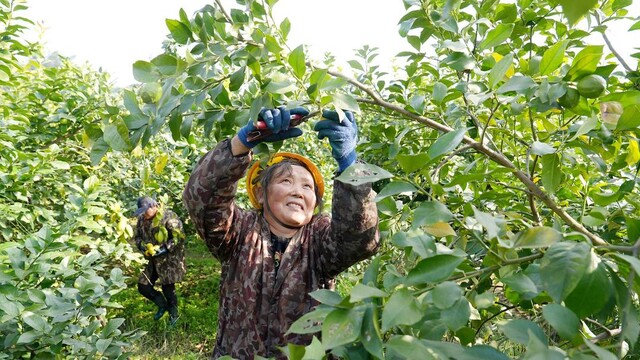 工人正在高县沙河镇白庙村采摘柠檬。(陈小芳 摄)