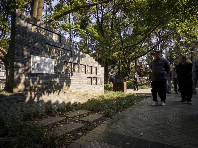 在成都市人民公园,市民驻足观看“成都大轰炸”纪念碑。新华社记者 唐文豪摄