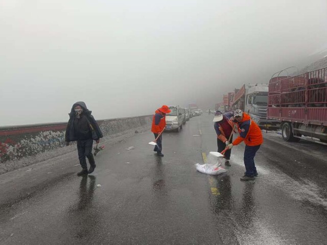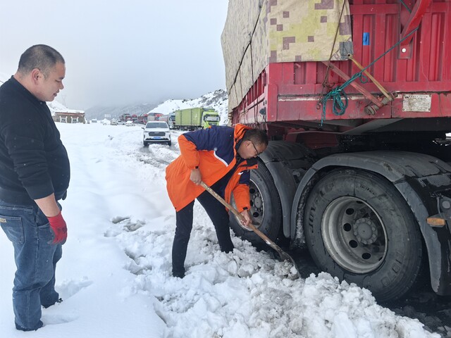 天刚蒙蒙亮,山上的贡布卡公路养护站里机器轰鸣。王康洪和同事们开着多功能除雪车,装好铁铲等工具上山除雪保通。在清扫完道路积雪后,还没等擦拭额头的微汗,王康洪便拿起手机拍起了视频。
