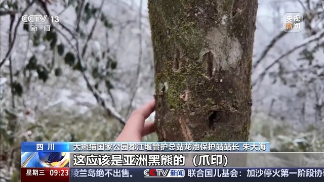 大熊猫国家公园都江堰管护总站龙池保护站站长 朱大海:这应该是亚洲黑熊的爪印。亚洲黑熊就喜欢爬这个树上,主要是去吃它的果实。