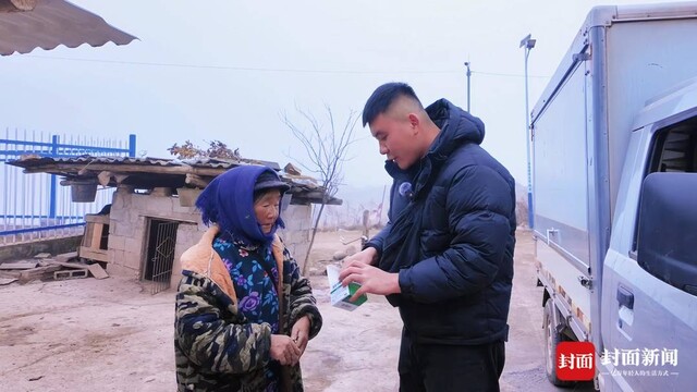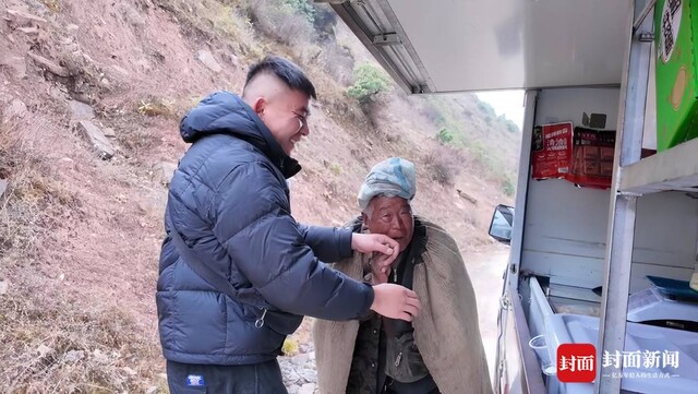 将车停在采竹村,他静静等着老人牛苦吉洛的归来。前一天,老人在外打工的儿子拜托他给妈妈带点感冒药。这位73岁的彝族奶奶是他在卖货中认识的第一位朋友,刚开始两人语言不通,靠着连比带划、连蒙带猜地交流。奶奶感谢杨兴富总是给她送吃的,彝族年时给他塞了一大块自家腊肉,杨兴富又给奶奶从城里买了一套新棉袄。奶奶很高兴,逢人便说,这是她另一个孩子给她买的。