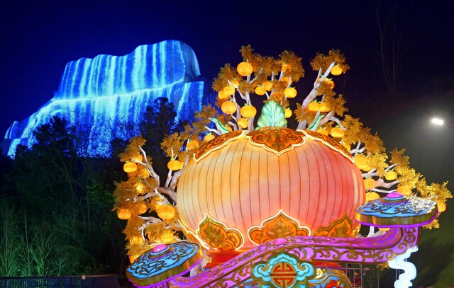 本届灯会大胆突破材质边界,将青花瓷器、稻草、药瓶、辣椒等环保再生材料及本土风物、潮流元素融入创作,通过“万物皆可成灯”的非遗技艺让寻常物品焕发艺术生命,诠释“变废为宝、万物有灵”的绿色理念与造物本心。在“匠心非遗”灯组板块,200斤稻草“点草成金”,化作近4米高的威严金毛犼;6000根扭扭棒缠绕出貔貅的灵动轮廓;15000枚火红辣椒、4.6万个回收药瓶,分别涅槃成绚丽的火凤凰与水麒麟。