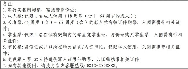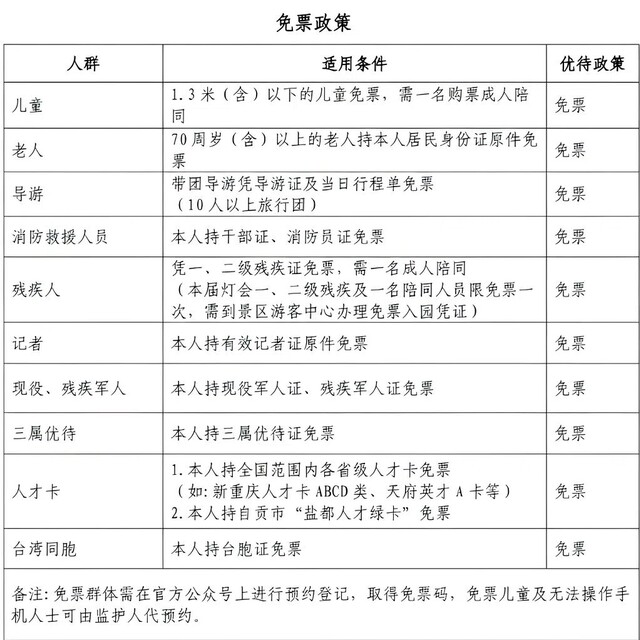 其中,免费入园人群为:1.3米(含)以下儿童(需一名购票成人陪同);70岁(含)以上老人(凭本人身份证原件);导游(当日带团导游凭导游证);消防救援人员(凭干部证、消防员证);残疾人(凭一、二级残疾证及一名陪同人员限免票一次,需到景区游客中心办理免票入园凭证);记者(凭本人有效记者证原件);现役、残疾军人(凭现役军人证、残疾军人证);烈士、因公牺牲军人、病故军人遗属(凭“三属”优待证);持人才卡人群(凭全国范围内各省级人才卡、自贡市“盐都人才绿卡”);台湾同胞(凭台湾台胞证)。