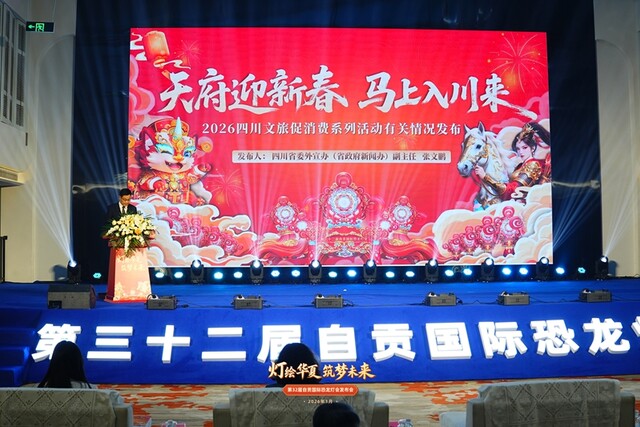 1月18日,“天府迎新春 马上入川来”——第32届自贡国际恐龙灯会亮灯暨全省迎春文旅促消费活动启动发布会在“中国灯城”自贡举行。据发布会消息,今年春节期间,四川将推出2000余场文旅商体活动,并发放各类消费券、推出门票优惠、提升服务保障,诚邀海内外游客“马上入川”,畅享巴蜀年味。