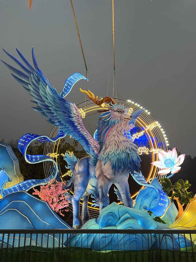 最终,200多斤稻草在彩灯工匠的巧手下,变成了一只雄赳赳气昂昂的金毛吼,一堆10立方的泡沫变成了一只插着翅膀昂首欲飞的白泽,6000多根扭扭棒被扭成了一只金光闪闪的貔貅。