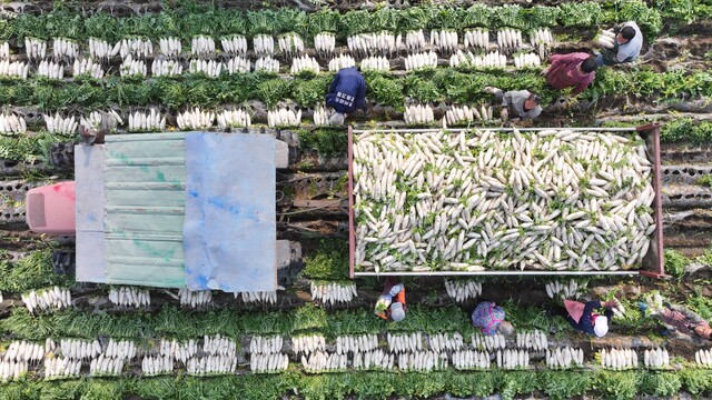 1月17日,湖北经销商徐先生又一次来到红江镇,在地头监督工人打包萝卜。长短均匀的白萝卜被装袋码齐,静待装车。48小时后,这批萝卜将出现在广东的菜市场。