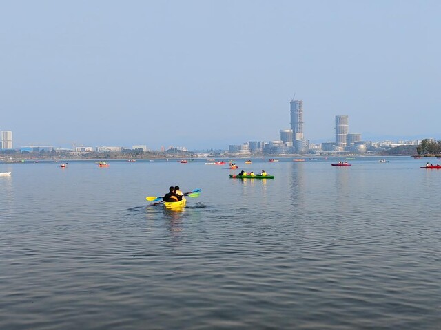 游客在成都兴隆湖划皮划艇。新华社记者 董小红 摄