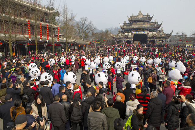 都江堰南桥广场上的熊猫玩偶与游客互动。何勃 摄