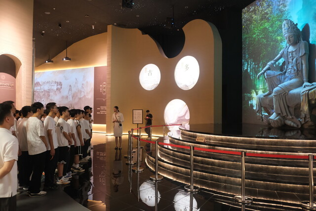 学生们在安岳石窟数字展示中心听讲解员讲述千年石窟故事。漆世平 摄