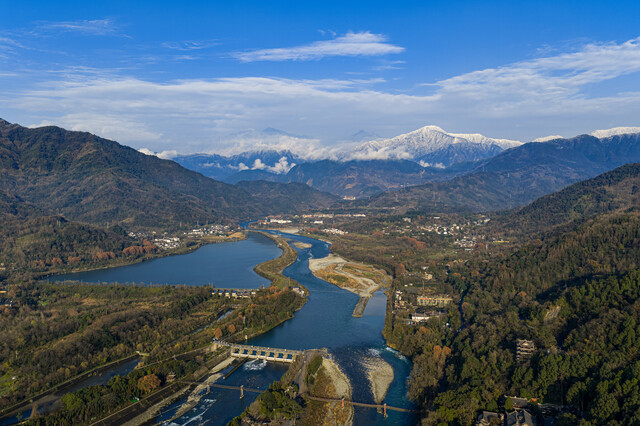 冬日里的都江堰,远处是皑皑白雪 。何勃 摄