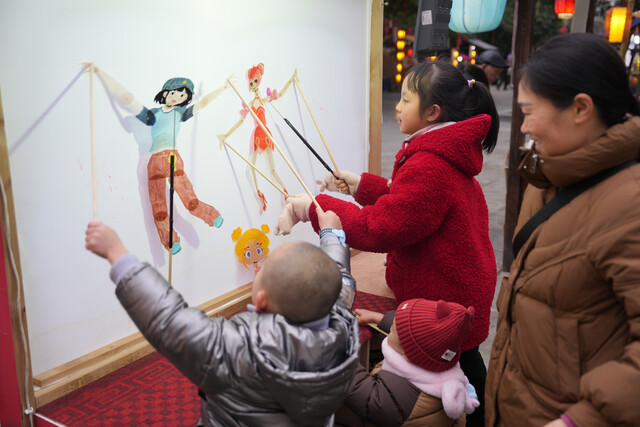 “双手各持皮影杆,右手握一根,左手握两根,轻挑帽檐是行礼,慢理胡须显神态,微调腰带露细节,一套动作尽显皮影礼节的精妙。”在阆中王皮影体验区,工作人员手把手指导观摩团操纵皮影。