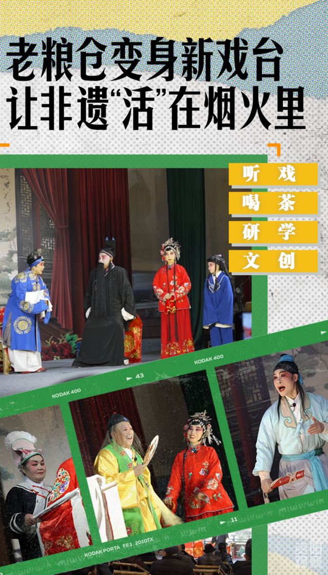 老演员们对技艺的坚守,与老粮仓改造中的创新巧思,共同彰显着非遗传承的匠心。429平方米的空间里,老式竹椅配木桌错落排布,盖碗茶香与戏韵交织,近百个座位座无虚席,印证着非遗文化的吸引力。