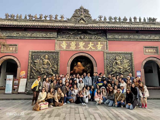 外国游客在成都大慈寺门口合影(四川省中国旅行社有限公司 供图)