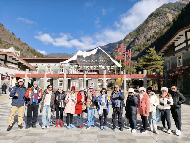 外国游客在达古冰川景区门口合影(四川省中国旅行社有限公司 供图)
