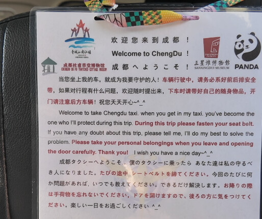 卜晔阳的车,外表与街头其他出租车无异,内里却处处透着“小心思”。为抵御夏日灼晒,他自装了遮阳帘;细心观察乘客状态,随时调整车速以防晕车;后座悬挂着中、英、日三语欢迎卡,上面写着:“欢迎来到成都,当您坐上我的车,就成为我要守护的人。”