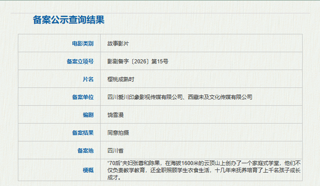 《樱桃成熟时》 由著名编剧饶雪漫操刀剧本,是本次备案中最具现实温度的作品之一。影片以南江县“70后”夫妇陈果、张蓉为原型,讲述他们在海拔1600米的云顶山创办家庭式学堂,十余年间抚养培育上千名孩子的故事。记者了解到,影片原型人物张蓉是当地留守儿童关爱事业的标杆,曾获“全国优秀童伴妈妈”荣誉,并当选四川省人大代表。