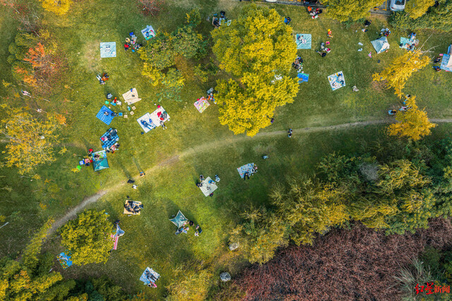 ▲成都各处公园周围绿草如茵,散布着各色野餐垫与人群 摄影:蒋光丛