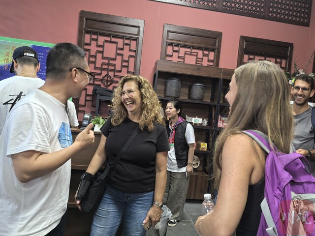 外国游客在武侯祠观赏川剧后,与剧组人员进行交流。