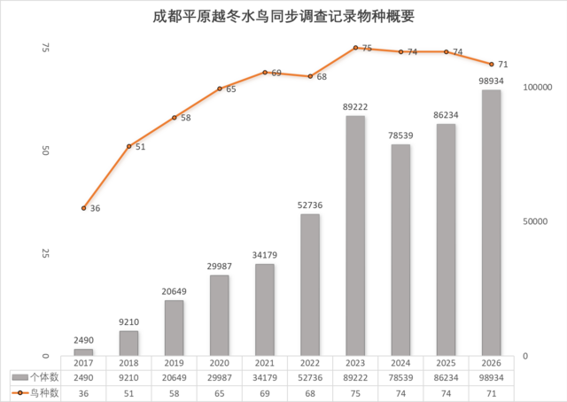 调查相关负责人表示,与第九轮调查记录的74种86234只相比,本轮调查记录的越冬水鸟总数量增加12701只,增幅约15%。“在调查范围和方法保持一致的前提下,整体数量的增长为成都平原湿地生态环境持续改善提供了积极信号。”