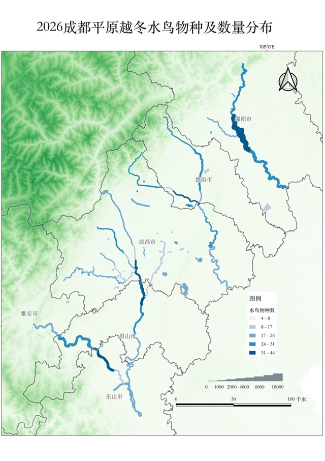 同时,调查共涉及成都、德阳、绵阳、眉山、乐山、雅安6个地级市的34个区县,共设置调查单元69个,包括岷江、沱江、涪江及其部分支流,以及越冬水鸟较为集中的水库、湖泊和水田等重要湿地。