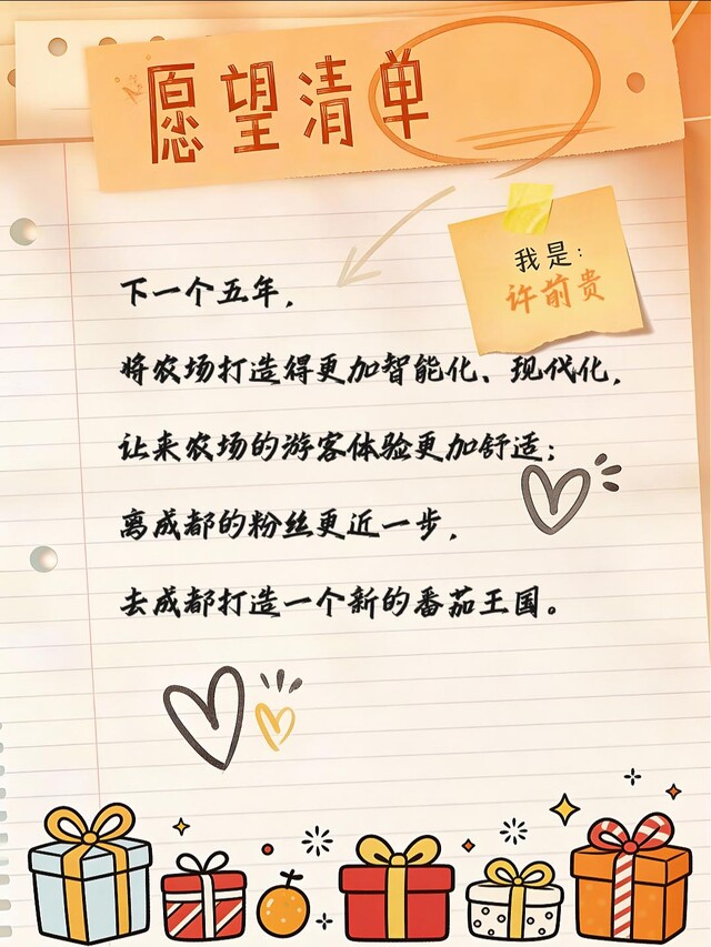 “我觉得要懂技术、懂管理和懂销售的全能型人才才叫新农人”,阿贵说,他想出去多走一走,多看一看,学习别人先进的生产和管理模式,提升自己在数字农业方面的不足之处。 在未来五年,他希望将农场打造得更加智能化、现代化,让来农场的游客体验更加舒适。同时,阿贵也希望离成都的粉丝更近一步,去成都打造一个新的番茄王国。