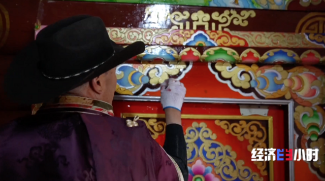 临近年关,四川甘孜藏族自治州炉霍县的村民家中,彩绘师彭措次里正手持画笔,为当地特色民居“崩科”上贺新年图样着色。