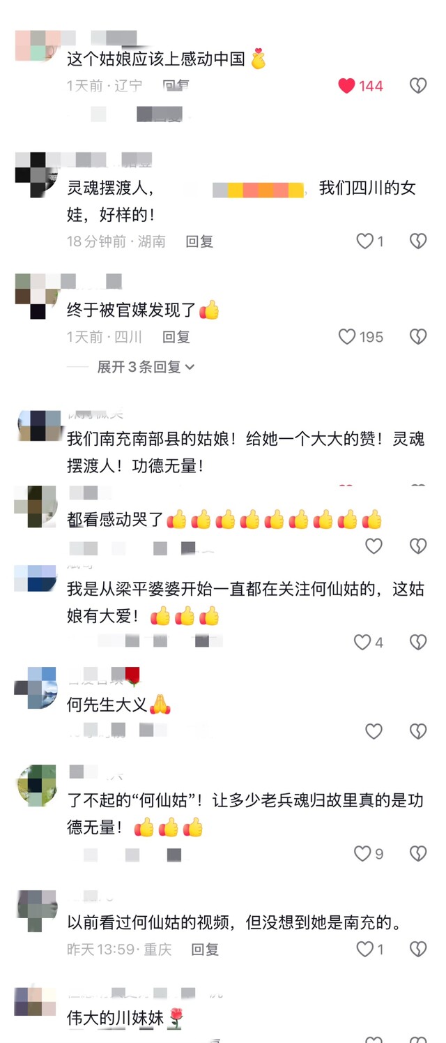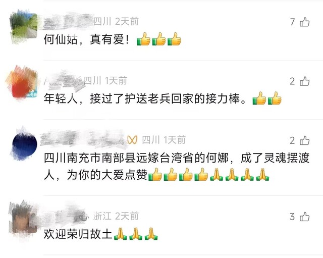 评论区里,称赞不绝于耳。“好样的!”“了不起的四川老乡!”“姑娘大义!”一位IP来自台湾的网友说:“以前听外省老伯伯说多想回到家乡,但因为两岸问题始终回不了。过世后终于有个善心人士帮忙老伯伯完成了遗愿,愿善心人士一生平安。”