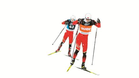 在视障组比赛中,领滑员是运动员的“眼睛”。2022年北京冬残奥会后,余爽开始与领滑员尚金财配合。在德国的两站赛事中,尚金财不仅全程帮他掐时间、观察对手动态,更在关键节点传递核心信息,成为他稳住局势的“定海神针”。