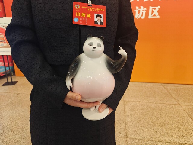 “委员通道”上,张鸶鸶带来一只“萌物”——“粉嘟嘟PinKoo”,它诞生于成都大学自研的大熊猫艺术设计大模型。“我们结合成都市花‘芙蓉’的粉色渐变和唐朝仕女画的神韵,打造了独具辨识度的粉色熊猫,同时赋予它温暖治愈的人格特征,体现了松弛、包容、坚韧、幽默的四川生活哲学,通过‘AI技术+艺术审美’的路径孵化出这个IP。”张鸶鸶介绍道,“粉嘟嘟”曾多次登上国内外授权展,受香港旅游发展局邀请赴港开展文化交流,在全球熊猫伙伴大会和熊猫家园潮玩中心重磅亮相,被30多个国家和地区的嘉宾和驻华使节看到,也被很多中外网络红人和自媒体账号推介。用兼具文化意象、潮流表达与商业潜力的熊猫文创,向世界展示了四川数字文创产业的创新活力。