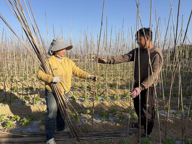 上午10点,在新街村灰怕浪村民组一处唤作红泥巴包包的半山坡上,普仕洋、张琼芳夫妇已经连续劳作了3个多小时,成果一目了然——今年新改造的2亩多新田上,立起了成片细密的豆架。