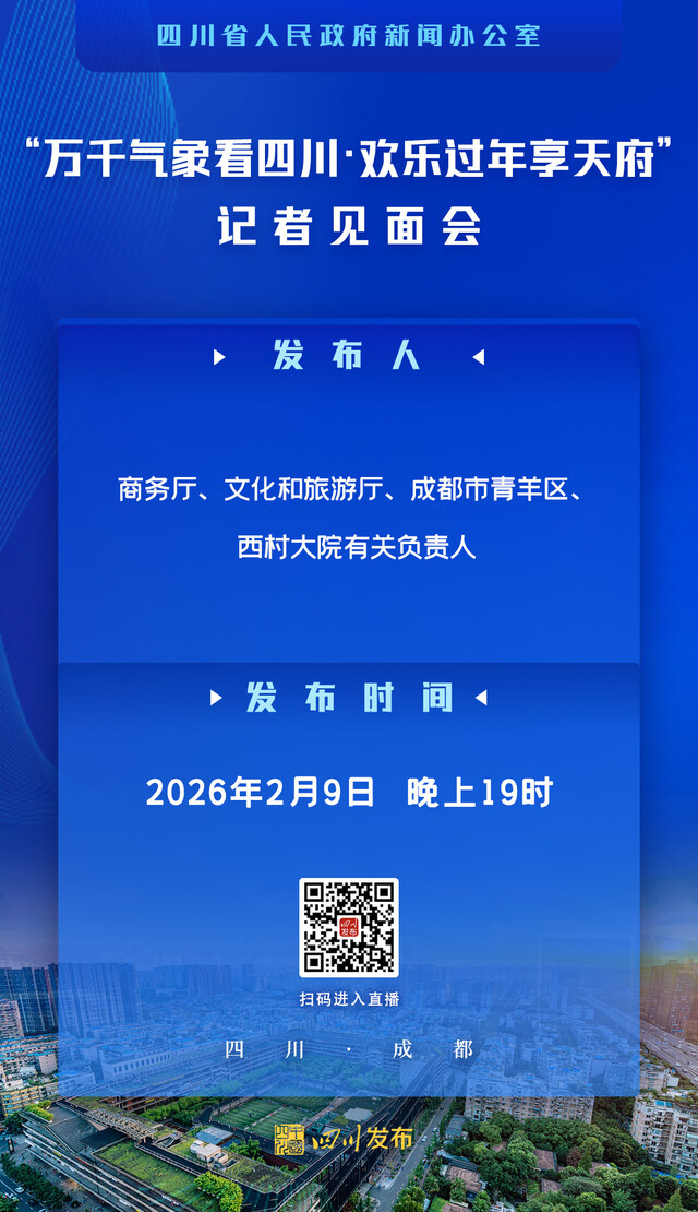 2026年2月9日(星期一)19:00,省政府新闻办将在西村大院举行“万千气象看四川·欢乐过年享天府”记者见面会,请商务厅、文化和旅游厅、成都市青羊区、西村大院有关负责人与记者见面交流。四川发布客户端将全程图文直播,敬请关注!