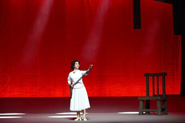 剧终场景尤为震撼人心:铿锵鼓点、象征红旗的璀璨红光与人物英勇就义的经典造型相互映衬,营造出雄浑悲壮的艺术氛围,将杨汉秀矢志革命的赤诚之心升华至顶点。这不仅是对革命先烈的深情致敬,更以传统川剧与现代舞台美学的深度融合,完成了震撼人心的视觉宣言,让革命精神跨越历史时空,在当代舞台焕发新的生机。