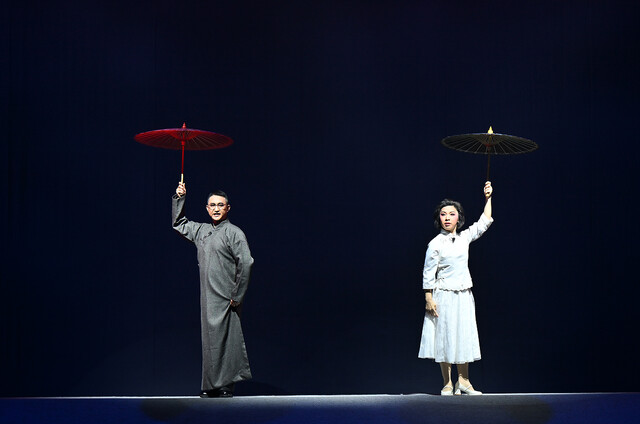 这种“大写意”与高度象征的美学贯穿始终。开幕时,舞台前方的不规则框架,寓意亟待冲破的旧制度牢笼;序幕里,杨汉秀与爱人李政在记忆中重逢,舞台以光影分割为两个时空,简练呈现革命征程的艰辛与个人情感的隐忍;杨汉秀在华蓥山乘坐滑竿,仅以两根竹竿写意呈现,全凭演员步法展现山路崎岖。这些都是传统川剧大写意手法的现代表达。