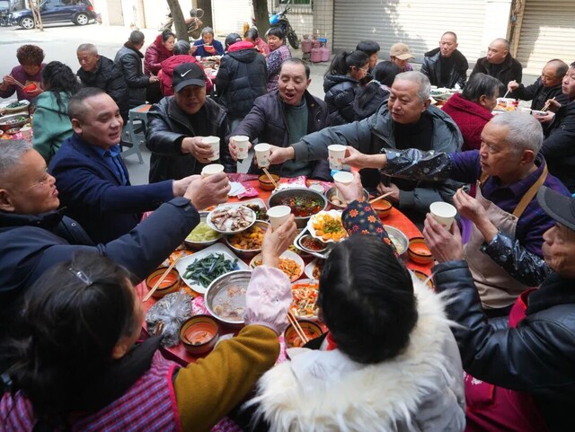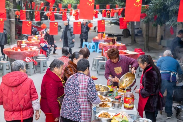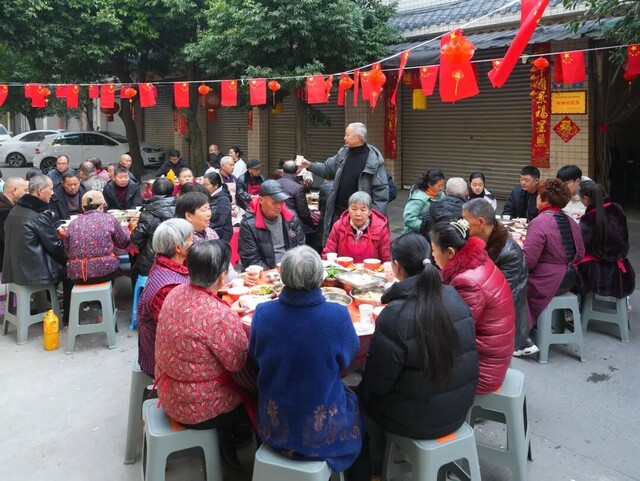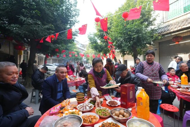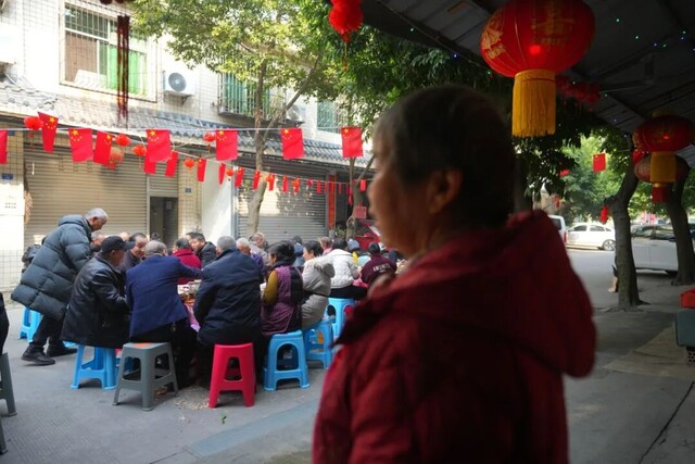 宋秀华没有急着入座。她站在街口,看着这热闹的场面——老人们笑呵呵地吃着,孩子们在桌间嬉戏,中年人互相夹菜,年轻人举杯祝福。