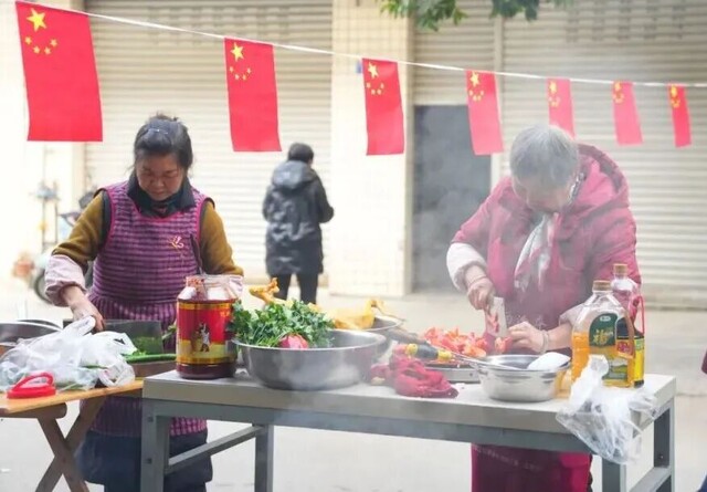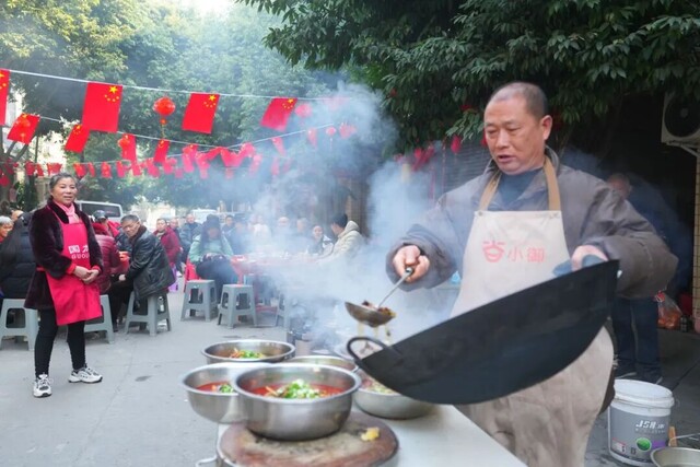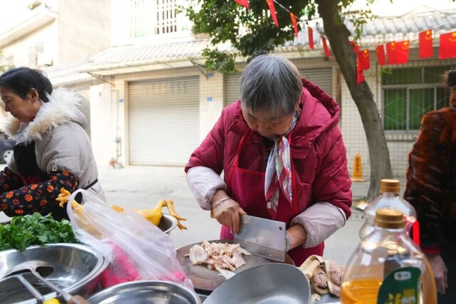 这不是谁家的厨房,而是涌泉街道共耕社区的一条街上,临时搭起的“露天灶台”。2月6日,腊月十九,社区居民宋秀华家门口的街道热闹起来,锅碗瓢盆的碰撞声、邻里间的招呼声、孩子们的笑闹声,交织成热闹而温暖的景象。