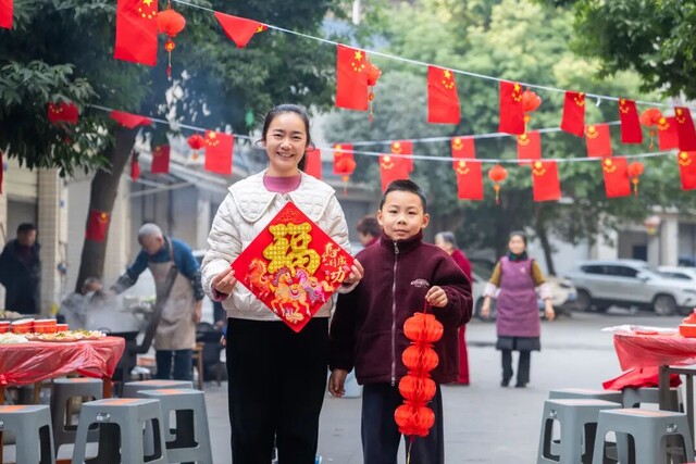 在蒸腾的烟火气之外,邻里们还自发张罗起节日氛围的营造——挂灯笼、贴福字,将团圆的仪式感细细织入街巷的细微角落。