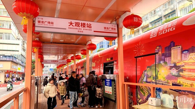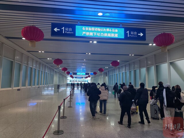 当天下午,宜宾西站出站口人流涌动。站台外,“宜宾西站向全市人民拜年”的标语前,不少刚下车的旅客举着手机拍照;站内,红灯笼、中国结早已挂上,年味扑面而来。