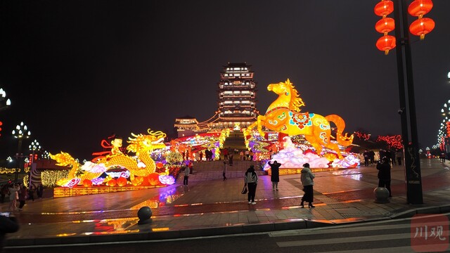 叙州区东楼、市政广场、长江公园一带,红灯笼高挂、流光溢彩,熊猫、骏马、哪吒等特色灯组错落有致,市民漫步其间,笑语盈盈。三江新区长江大桥“万马奔腾”灯组现代绚丽,与江面波光相映成趣。