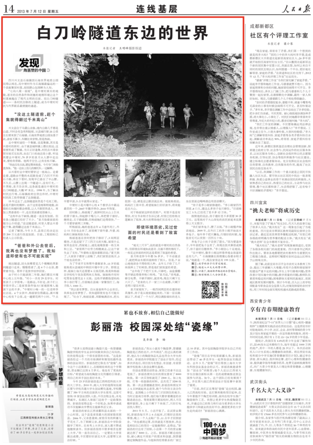 2013年7月12日,《人民日报》刊发中埂村报道《白刀岭隧道东边的世界》。